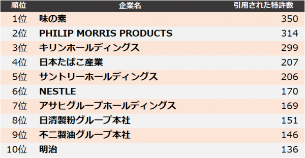 集計の結果、2022年に最も引用された企業は、1位 味の素、2位 PHILIP MORRIS PRODUCTS、3位 キリンホールディングスとなりました。