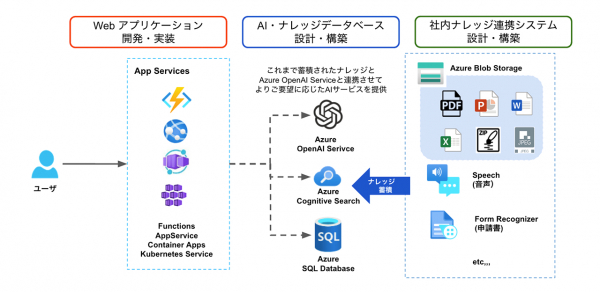 ▲Azure OpenAI Serviceとナレッジデータベースを連携させたWebサービスのアーキテクチャ例