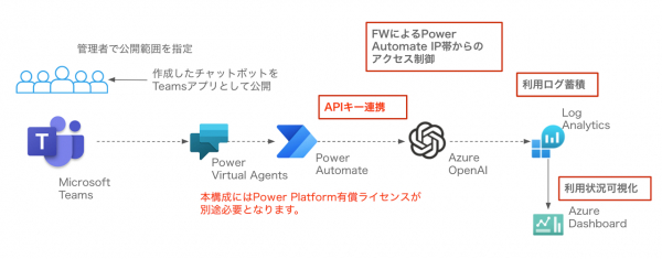 効果的なプロンプトによる回答精度の向上や、APIへの認証、ネットワーク閉域化、監査ログの収集などセキュリティや監査を意識した設定なども考慮することで、安心したAI環境をご利用頂けます。