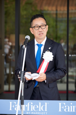 本施設はこれまでのフェアフィールド・バイ・マリオットの中で、海水浴場に面する最初の施設、そして1階にはテラス付きの客室、4シングルルームなど、国内で初めての一工夫が見られます。淡路市にも1番、唯一が多く、例えば、線香の生産量1位だったり、明石海峡大橋も世界で1位でした。本施設のように、初めての一工夫がこれからも淡路に増えていくことを期待しています。お越しいただくお客様には、ホテルを拠点に、淡路東浦の持つ、食・自然・文化・歴史を味わっていただければ幸いです。淡路島は古事記や日本書紀で最初に生まれた島と称され、歴史・食・自然豊かな島であります。近年では2025年に開催される大阪・関西万博に向け、大阪ベイエリアの活性化に向け、様々な取り組みを推進しています。よりよい淡路島、淡路市となって皆様をお迎えできるように努めてまいります。淡路島はシーズンによる観光客の差がありますが、本ホテルと地域が連携して活性化していきます。