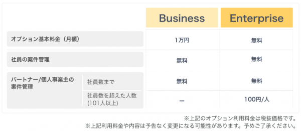 - パートナー/個人事業主の案件管理: 社員数まで無料/社員数を超えた人数(101人以上) 100円/人(月額/税抜)