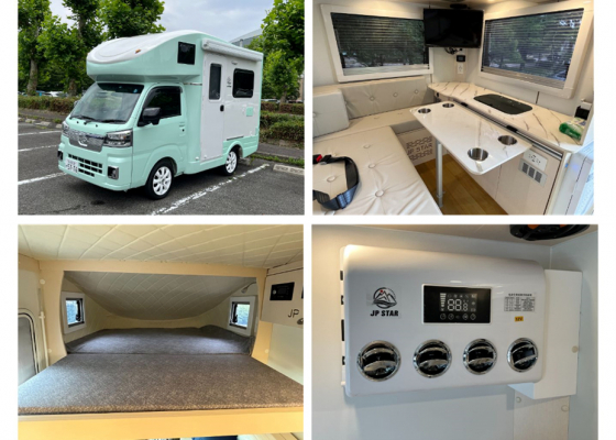 キャンピングカー人気No.1として話題の軽キャンパーJP STAR Happy 1+ 。ダイハツハイゼット4WDトラックベースのキャブコンで室内装備も充実しています。軽トラベースで、狭い道でも運転しやすくなっています。一方で、居住スペースは、キャブコンの特性を活かして広大です。400Ahのリチウム電池搭載で、エアコン、電子レンジも不自由なく使え、まるで1ルームマンションのように快適です。