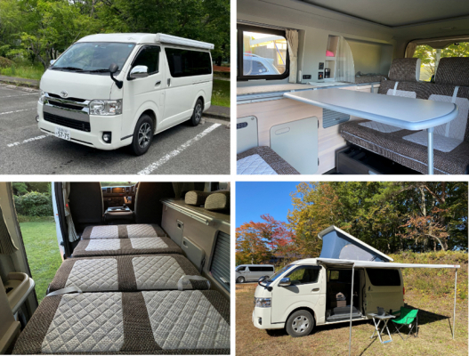 ハイエースがベースのキャンピングカーです。ポップアップルーフ、サイド・オーニング、網戸・FFヒーター付きで4輪駆動、冬はスタッドレスで年間を通じて乗ることができます。冷蔵庫、カセットコンロ、1口シンク、AC電源等の設備があります。テーブル、椅子、シェラフ、ポータブル電源、Wi-Fiルーター等のレンタルも可能です。