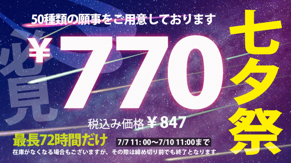 スポーツブランドBODYMAKER(ボディメーカー)は、日頃のご愛顧に対する感謝の気持ちを込めて、2023年7月7日(金)より7月10日(月)まで、期間中、BODYMAKER公式サイト及び、直営店舗にて年に一度の「七夕セール」を開催します。約50点のスポーツウエアやシューズ、トレーニング用品など、どれもこれも¥770+税(税込み¥847)で販売いたします。「最大59%OFFの大幅値下げ商品」もございます。まさに最長72時間の戦い!無くなり次第終了、在庫限りの大セール。早い者勝ちですのでお早めにお買い求めください。BODYMAKER(ボディメーカー)は、今年も楽しい企画満載のイベントをいたします。お楽しみに!ぜひ 一度ご覧ください。(直営店舗は7月9日(日)まで)