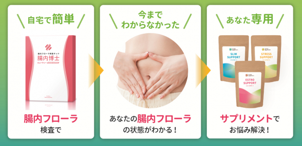 【腸内博士】は自宅で便を採取しポストに投函するだけでかんたんに自分の腸内フローラがわかる検査サービスです。「(1)女性ホルモン(2)痩せホルモン(3)幸せホルモン(4)腸内環境」の4項目を解析。検査結果に基づいた生活アドバイスやサプリメントのご提案で腸活エイジングケアをトータルサポートします。