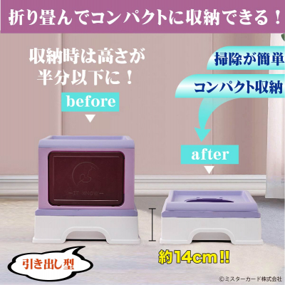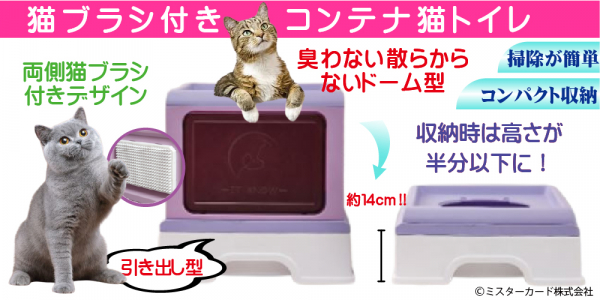 ミスターカード株式会社(本社所在地:埼玉県川口市)は、いつでも自分でブラッシング!ドーム型猫用トイレ「猫ブラシ付きコンテナ猫トイレ」を2023年7月1日(土)から発売します。臭わない、砂で散らからないドーム型猫用トイレは、手を汚さず後始末が簡単なスコップ付属の引き出しタイプです。天板で砂を落とす設計で、天井や前面どちらからの出入り可能。広い空間で動きやすく、折りたためば約14cmに収納できるので長期旅行や知人に預ける時にも便利な、キャットトイレはいかがでしょう。