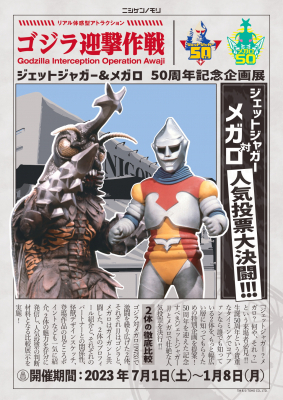ニジゲンノモリの大人気アトラクション「ゴジラ迎撃作戦」ゴジラミュージアム内で、映画「ゴジラ対メガロ」の公開50周年を記念し、ミュージアム企画展「ジェットジャガー/メガロ特別展」を2023年7月1日(土)~2024年1月8日(月)の期間限定で開催致します。本企画展では、50周年を迎える作品の昭和レトロかつコミカルなオリジナル展示のほか、名場面を再現したジオラマの展示を行います。また、映画の中で熱い闘いを繰り広げた、ジェットジャガーとメガロの『人気投票大決闘』を実施します。人気投票には、ジェットジャガーとメガロとゆかりのあるあの怪獣たちからも応援! ファン必見の特別展を、ゴジラ愛溢れる仲間とともに遊びつくそう!