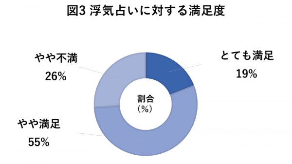 「とても不満」と回答した方は本調査ではみられず、全体的に浮気占いを受けて満足している方が多いことが明らかとなりました。