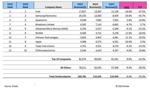メモリー市場とMPU市場は、半導体市場の主要な分野であり、落ち込みに寄与しています。2023年第1四半期のMPU市場は131億米ドルで、2022年第1四半期の200億米ドルの65%にとどまりました。メモリ市場はさらに悪化し、2023年第1四半期は193億米ドルで、436億米ドルだった2022年第1四半期の市場のわずか44%でした。MPUとメモリを合わせた市場は、2023年第1四半期で19%減少し、前四半期比(QoQ)で9%の減少となりました。