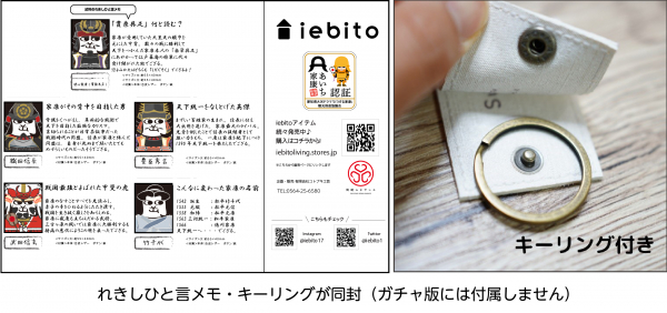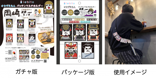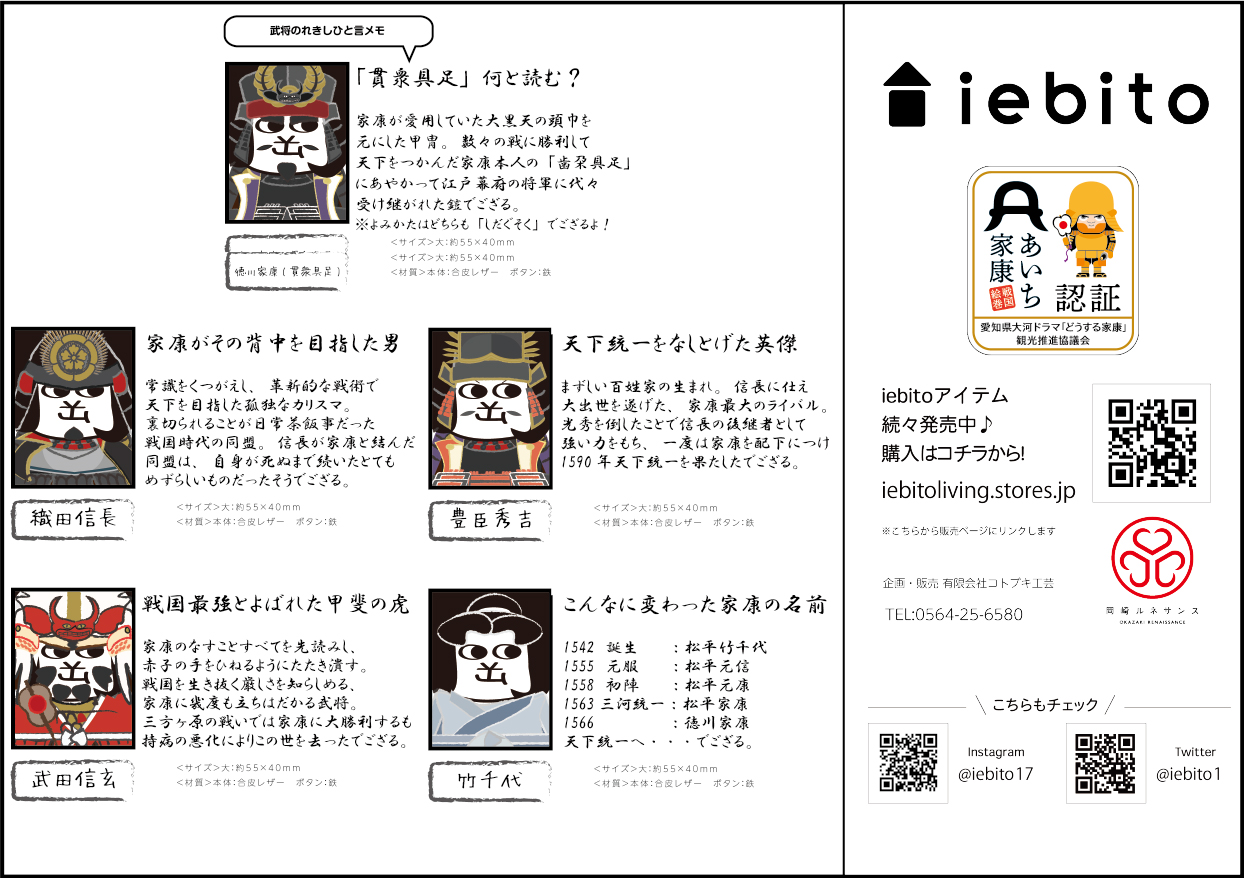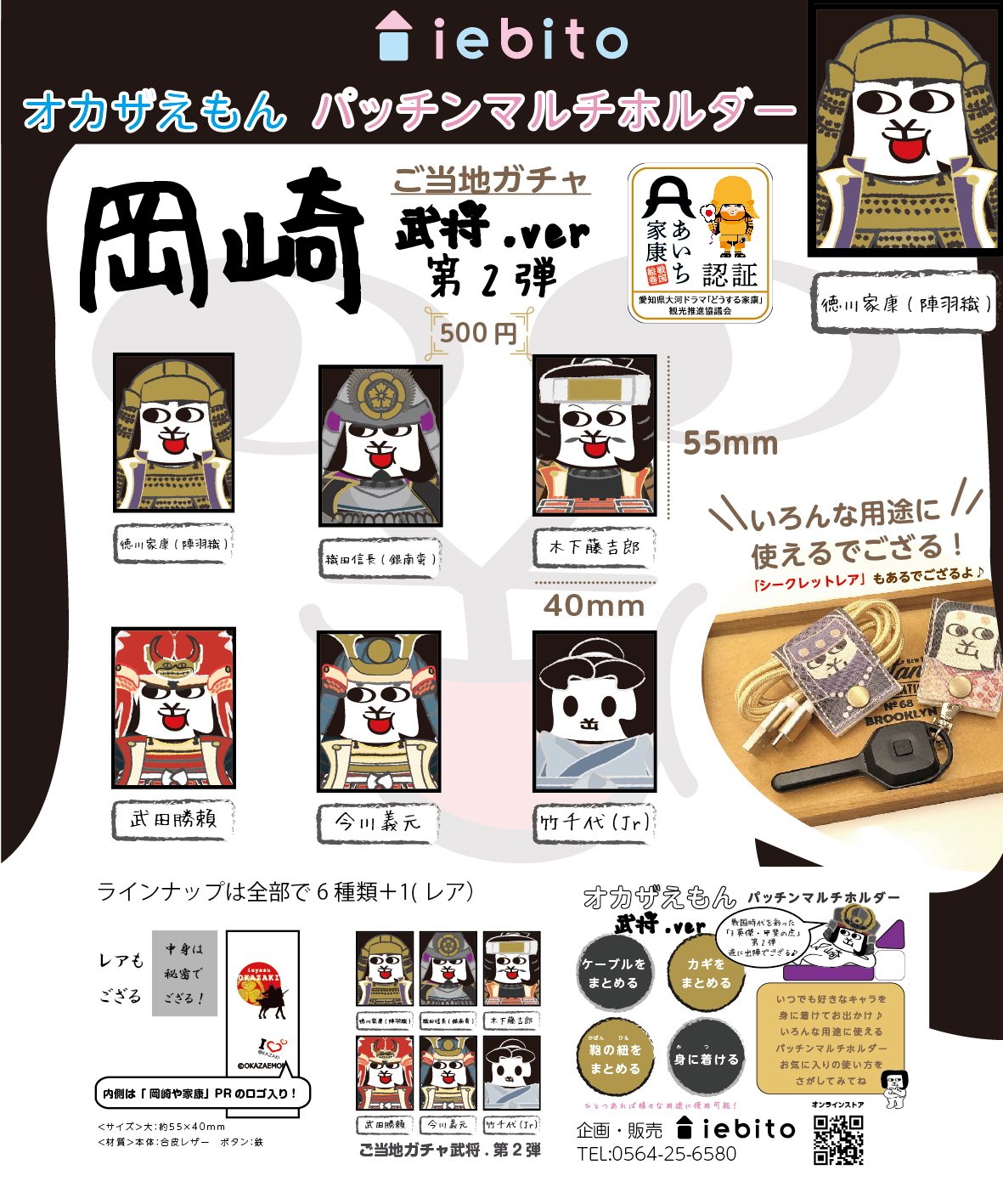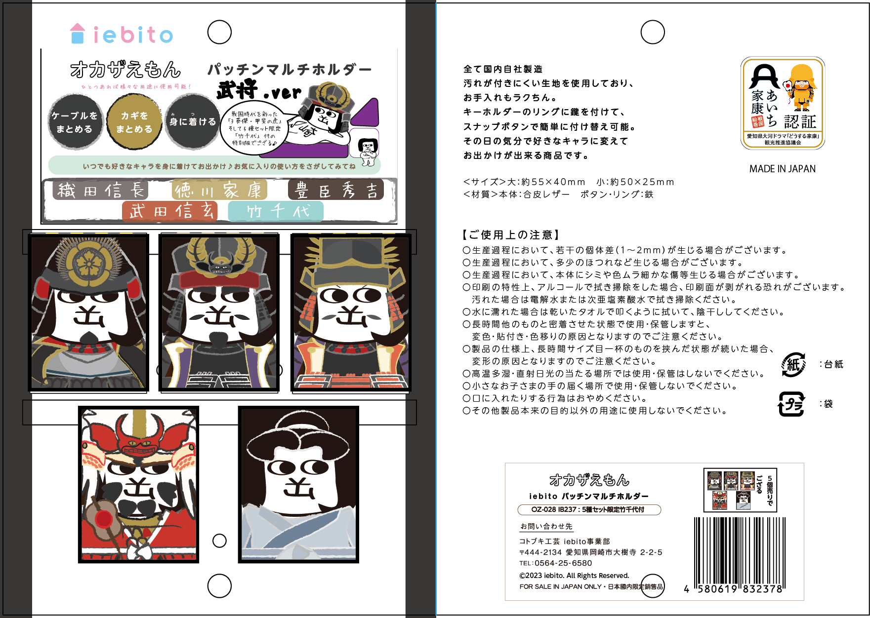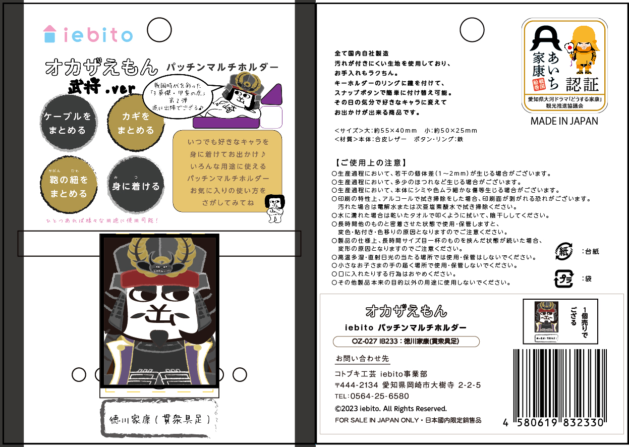 【オカザえもんパッチンマルチホルダー武将】は、大河ドラマ初期の舞台となった「岡崎市」の家具職人が1点1点、手作業で製造。身の回りのモノを束ねたり、スマホストラップやバッグのベルトに身に着けて岡崎観光のお供にも最適な雑貨アイテムです。パッケージは(1)単体:A6 (2)5種セット:A5と手に取りやすいサイズながら、旅のお土産としても満足感の高いデザインです。中には各武将の一言メモを封入、歴史上どんな人物だったのか学べる仕様になっています。