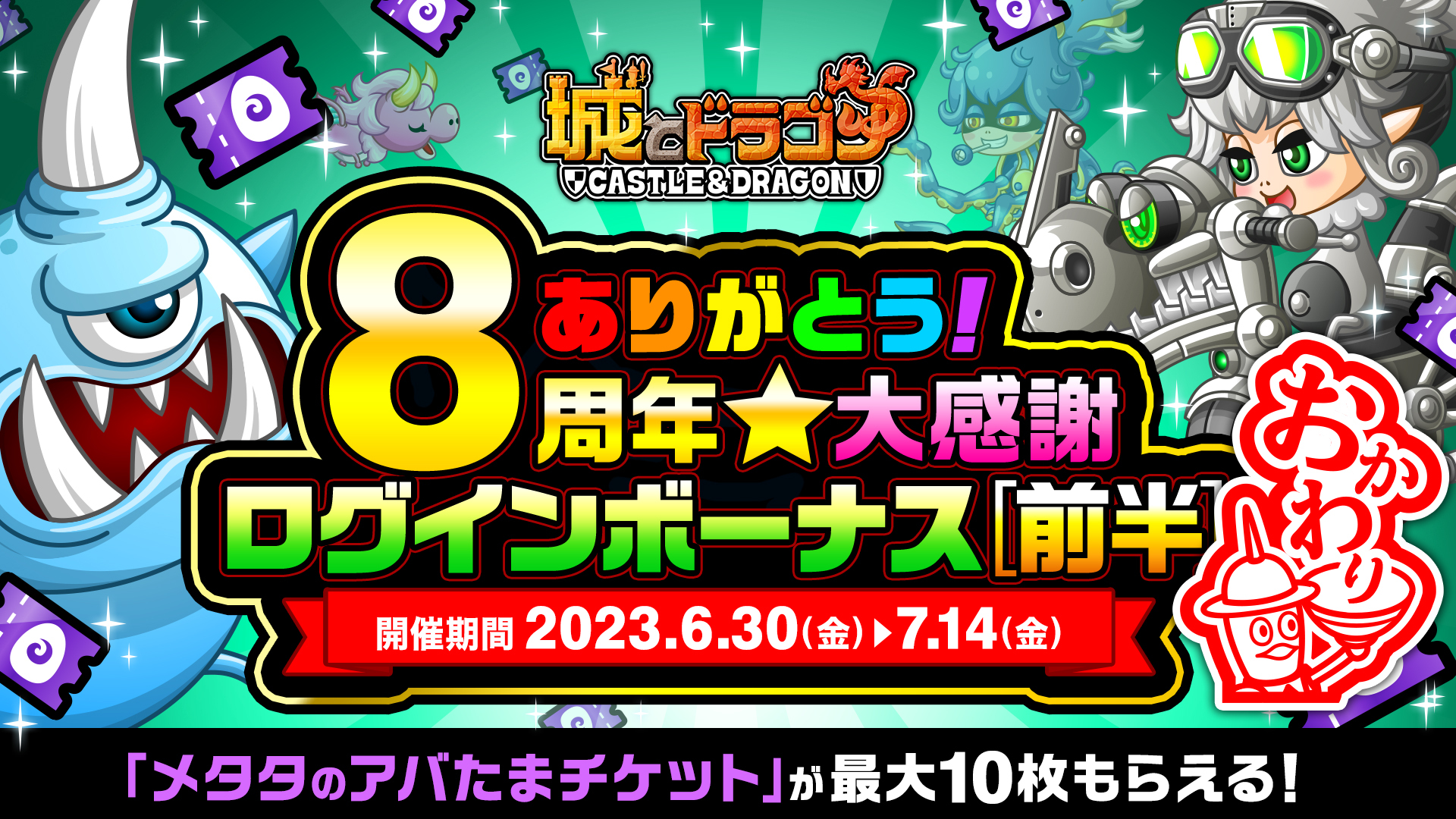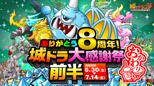 株式会社アソビズム(本社:東京都千代田区、代表取締役:大手智之)は、App Store・Google Playにて好評配信中の『城とドラゴン』で、「ありがとう8周年!城ドラ大感謝祭おかわり(前半)」を2023年6月30日(金)より開催いたします。