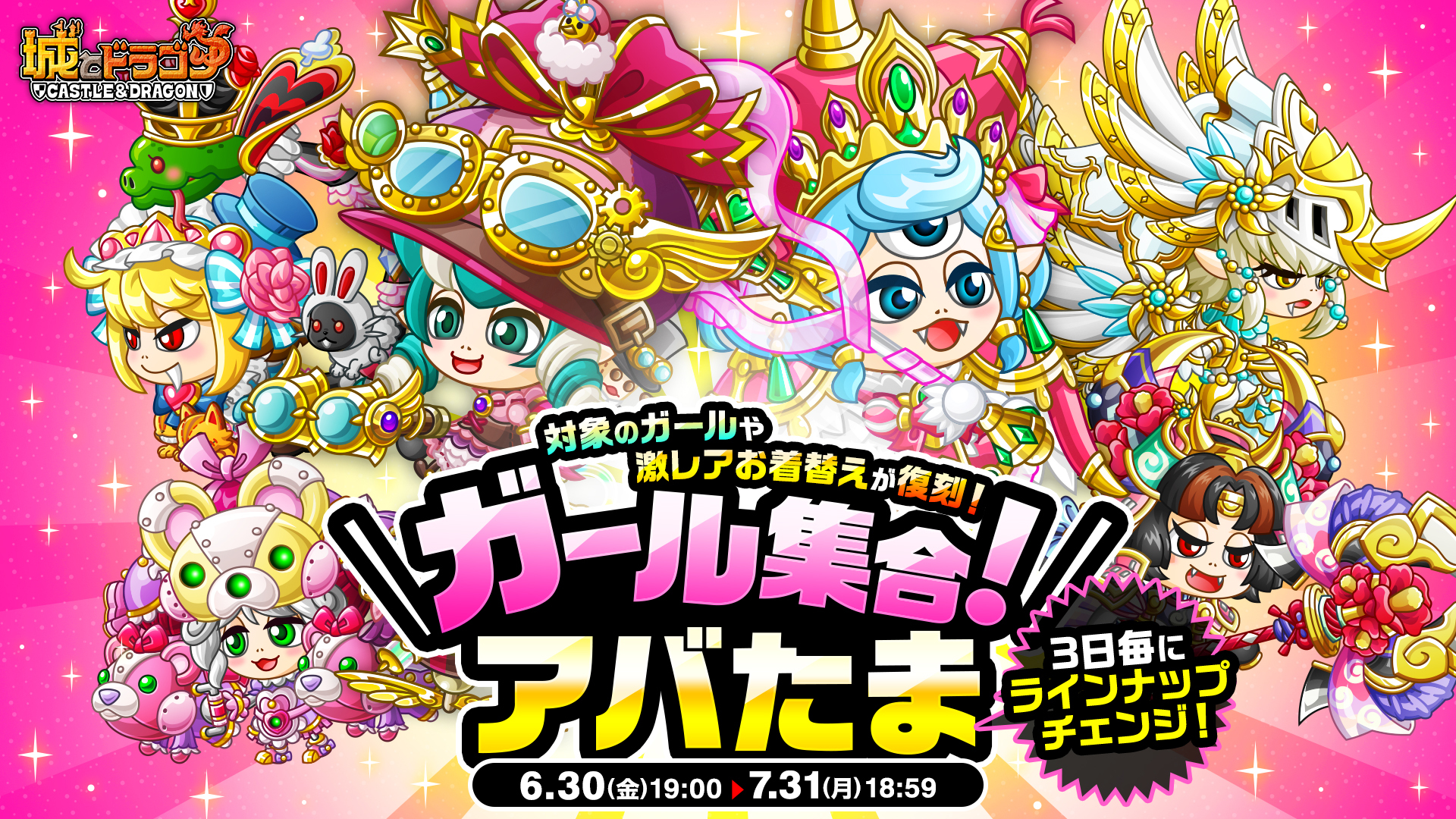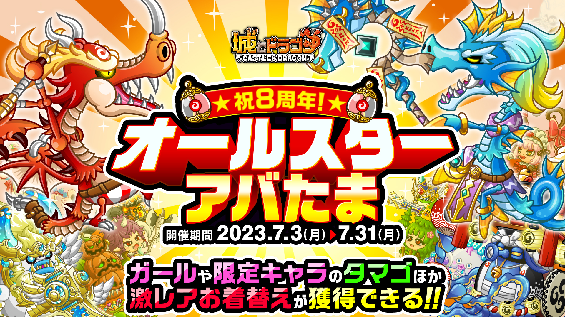 2023年2月に『城とドラゴン』で8周年を記念して開催された大盤振る舞いキャンペーンが再び!好評だった、必ず“8888ルビー”以上が当たる「8888ルビー以上確定?!ルビーアバたま」や、最高“88888ルビー”と特別なフレームが当たる「大感謝祭!城ドラ宝くじ」に加え、「ガールソング獲得チャンス」や「ガール集合!アバたま」といった新要素も登場します。「8周年おかわり」もぜひお楽しみください!