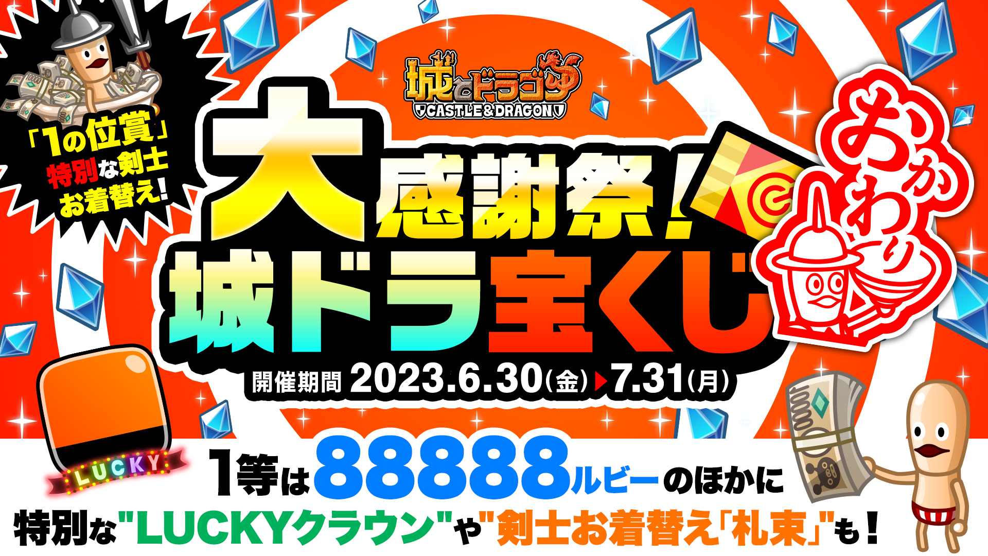 8周年を記念したスペシャルイベント「大感謝祭!城ドラ宝くじ」が再登場!「8周年記念ミッション」で入手できる「宝くじ」には、1枚につき6桁の番号が書いてあります。1等で最高88888ルビーが当たるほか、特別な“LUCKYクラウン”や、剣士の限定武器“札束”を。また、1の位賞当選者には1000ルビーに加え、剣士鎧「札束風呂」を進呈!くじの抽選結果は、8月上旬発表予定です。ぜひ城ドラ史上最強の運試しを楽しみましょう!
