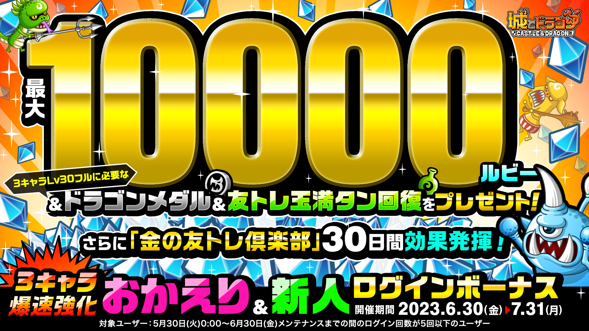 新規プレイヤーと、ひさしぶりにゲームにログインしてくれた復帰プレイヤーを対象に、好きなキャラ3体をLv30まで育成するのに必要な“ドラゴンメダル”や“友トレ満タン回復”、“CP”に加え、最大10000ルビーや「金の友トレ倶楽部」30日間無料がプレゼントされます。