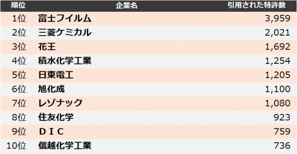 集計の結果、2022年に最も引用された企業は、1位 富士フイルム、2位 三菱ケミカル、3位 花王となりました。