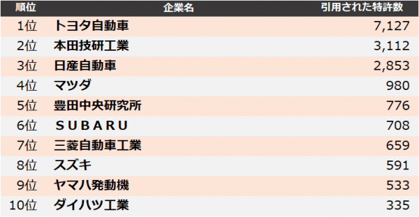 自動車メーカー業界の被引用件数上位30社のランキング