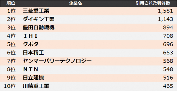 集計の結果、2022年に最も引用された企業は、1位 三菱重工業、2位 ダイキン工業、3位 豊田自動織機となりました。