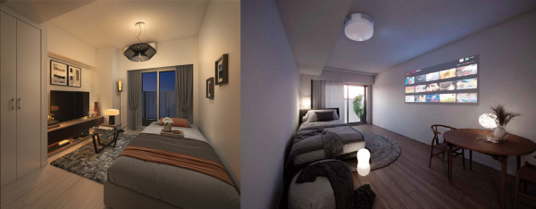 各住戸の洋室照明には照明一体型3in1プロジェクターを設置しました。映写する壁にはプロジェクター用壁紙を採用したので、YouTube等の動画サービスが大画面&高音質スピーカーで臨場感のあるホームシアターを楽しむことができます。