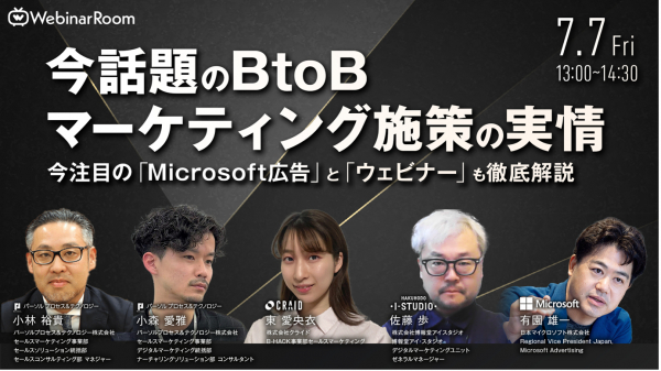 ビジネスマンの役に立つ動画がいつでも無料で観られるウェビナープラットフォーム「Webinar Room(ウェビナールーム)」(https://webinar-room.net/)を運営する株式会社ヒトクセは、2023年7月7日(金)13:00~に株式会社博報堂アイスタジオ、パーソルプロセス&テクノロジー株式会社、日本マイクロソフト株式会社、株式会社クライドにご登壇いただき” 今話題のBtoBマーケティング施策の実情~今注目の「Microsoft広告」と「ウェビナー」も徹底解説~”をテーマに共催ウェビナーを開催いたします。