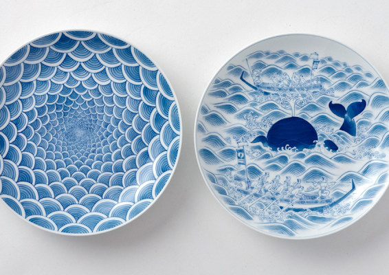 巧みな筆づかいの染付、伝統技法の置き上げ、長崎の鯨の文化が溶け込む鯨のモチーフ。光雲窯ならではの三川内焼をお愉しみください。 制作実演 8/14(月).15(火)