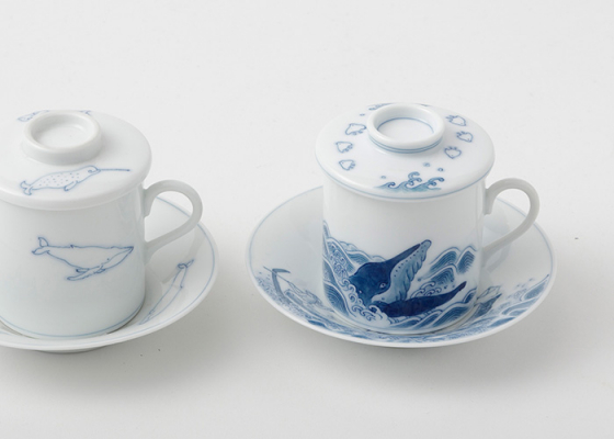 クジラのモチーフを描きはじめたのは、独立した次の年からです。みかわち陶器市に出店しはじめて2、3年したときに、たまたま私が描いたクジラのコーヒーカップを購入してくれたお客さんがきっかけでした。その方が次々に注文をしてくれました。だからこそ、クジラを正確に描かなければいけない。お客さんからも資料を送ってくれたり、「マッコウクジラはこういう尻尾だよ」と教わったりもしました。