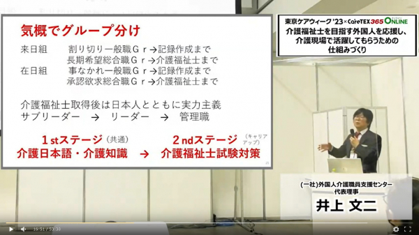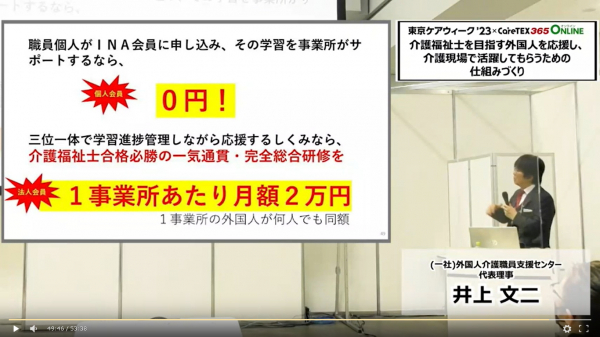 東京ケアウィーク'23(3月23日)で実施されたセミナーの収録動画が無料で視聴できるようになりました。動画配信期間は6月26日から9月25日までの3か月間限定になります。3年連続外国人介護福祉士国家試験合格者数日本一のオンラインコース実績を達成した一般社団法人外国人介護職員支援センター(千葉県市川市)の代表、井上文二が、費用をかけずに外国人介護職の教育育成支援を可能にするノウハウを解説しています。