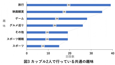 続いて「映画鑑賞」が多いものの、いずれの趣味も回答数に大きな差はみられず。カップルが行っている共通の趣味に関しては多岐にわたっている様子がうかがえました。