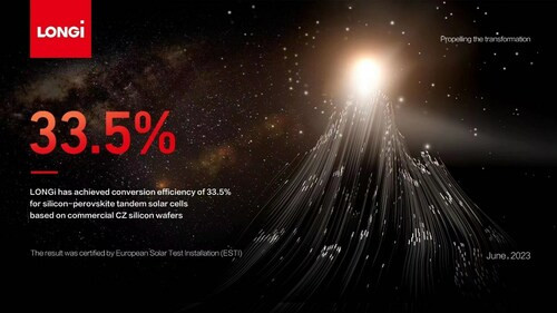 西安(中国), 2023年7月3日 /PRNewswire/ -- LONGi(ロンジ、本社:中国西安市)は、6月14日からドイツで開催された太陽光発電の大型展示会「Intersolar Europe 2023」において、ペロブスカイト/シリコン・タンデム太陽電池セルで33.5%の変換効率を達成したことを発表しました。