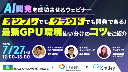 AIを自社で開発する会社は増えつつありますが、成功に導くための最適な環境づくりに迷いがある方が多くおります。今回のウェビナーでは、東京エレクトロンデバイス、フィックスターズの2社より、現場の状況に合わせてオンプレでも、クラウドでも開発できる、最新GPU環境の使い分けのコツをご紹介します。AI開発を成功させたい方は、ぜひご参加ください!