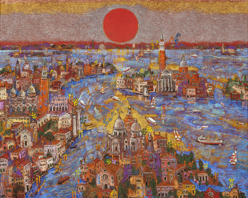 アドリア海を背景に、朝陽によって鮮やかに浮かび上がるヴェネツィアの街並みを俯瞰的に描いている。カナル・グランデ(大運河)に寄り添うように築かれた街並みや離島にそびえる美しい教会や鐘楼が、水面に反射する陽光に包まれ、繊細優美な抒情性を醸し出している。若き日のヴェネツィア留学の記憶が詰まった記念碑的作品。