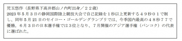 児玉選手は、男子400mハードルの日本代表として出場いたします。