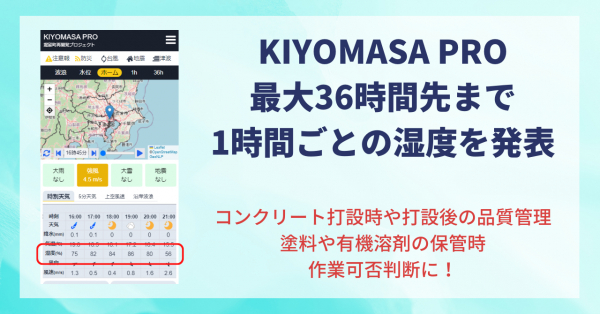 建設現場向け気象情報を提供する株式会社ライフビジネスウェザー(本社:東京都中央区、社長:鈴木俊成)は、2023年7月5日に、気象リスク管理モバイル「KIYOMASA PRO」に、現場ピンポイントの最大36時間先の湿度予測を新たにリリースされたことをお知らせ致します。