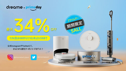 東京、2023年7月5日 /PRNewswire/ -- 高速デジタルモーター性能世界トップクラス、急成長を遂げる家庭用床掃除機の総合メーカーDreame Innovation Technology (Suzhou) Co.,Ltd. (略称「Dreame Technology(ドリーミーテクノロジー)」、以下「Dreame(ドリーミー)」、本社:中国蘇州)の日本支社Dreame Technology Japan株式会社 (以下「ドリーミーテクノロジージャパン」)は、「プライムデー先行セール」※期間を含む7月9日(日)00:00~7月12日(水)23:59の4日間にわたってAmazon.co.jp※で開催される「Amazon プライムデー」において、人気製品のDreame(ドリーミー)エントリーモデルロボット掃除機と水拭き掃除機がプライム会員限定のキャンペーンを実施致します 。