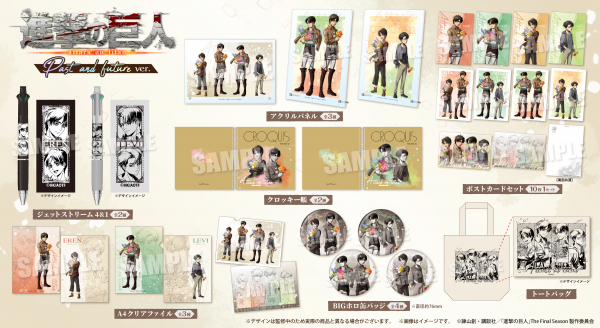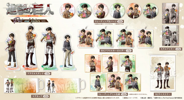 フェアに合わせ、エレンとリヴァイの大人の姿と子供の姿を新規描き下ろしした《past and future ver.》のイラストを使用した各種グッズをアニメイト限定販売いたします!こちらの商品は、2023年7月5日(水)より、事前予約をスタートいたします。ご予約していただいた商品も、特典の配布対象となりますので、ぜひお見逃しなく…!
