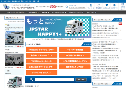 当サイトは、これからキャンピングカーの購入を検討されている方へ向けた日本最大級のキャンピングカーの比較サイトです。国内・海外を含む850台以上のキャンピングカーを、価格や車両サイズ、就寝人数やオプション装備など、約60種類の項目からスペック比較ができ、どのキャンピングカーが人気かを一定期間の閲覧数を基にランキング形式で表示。