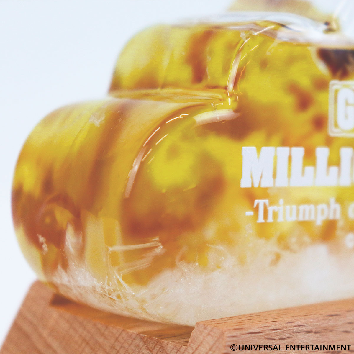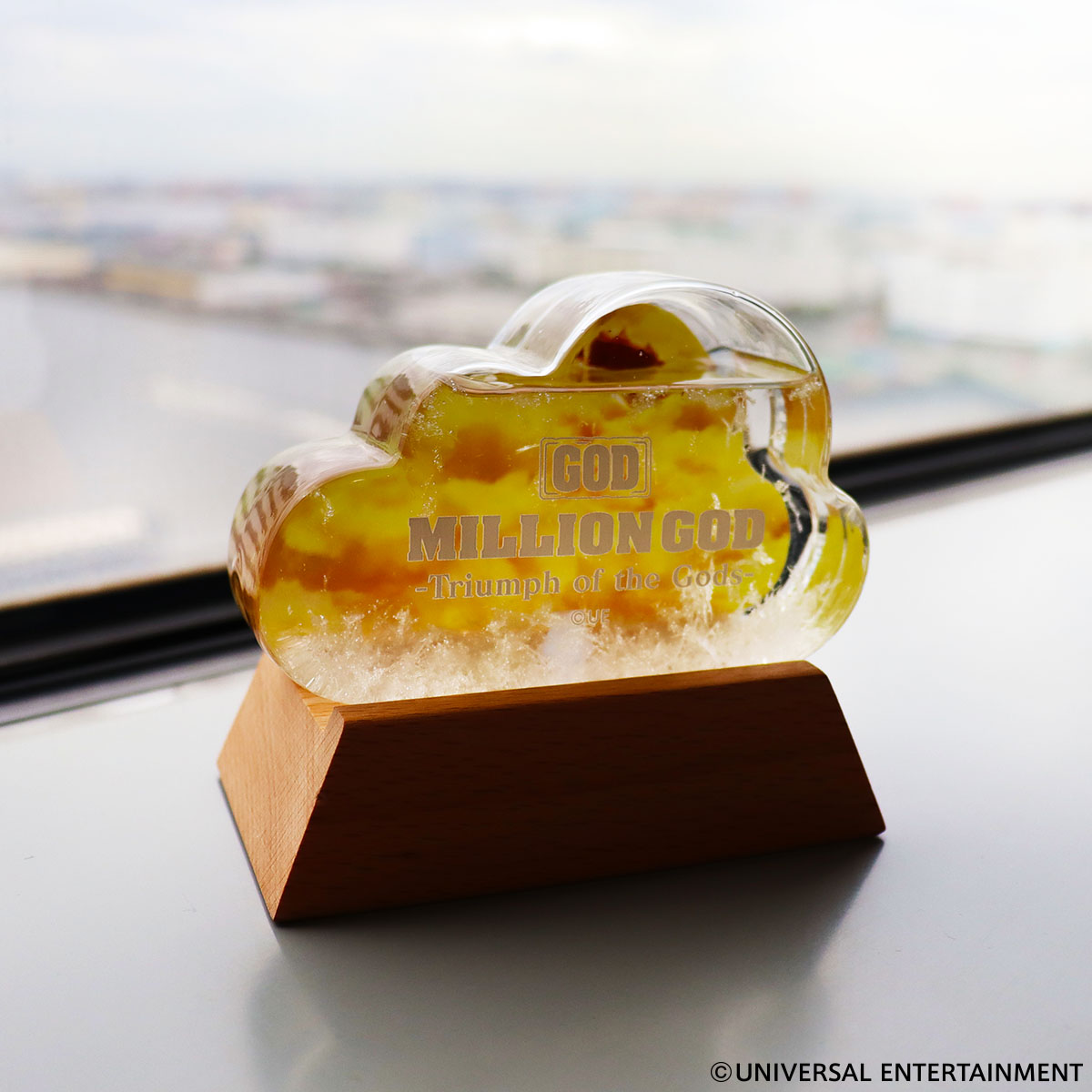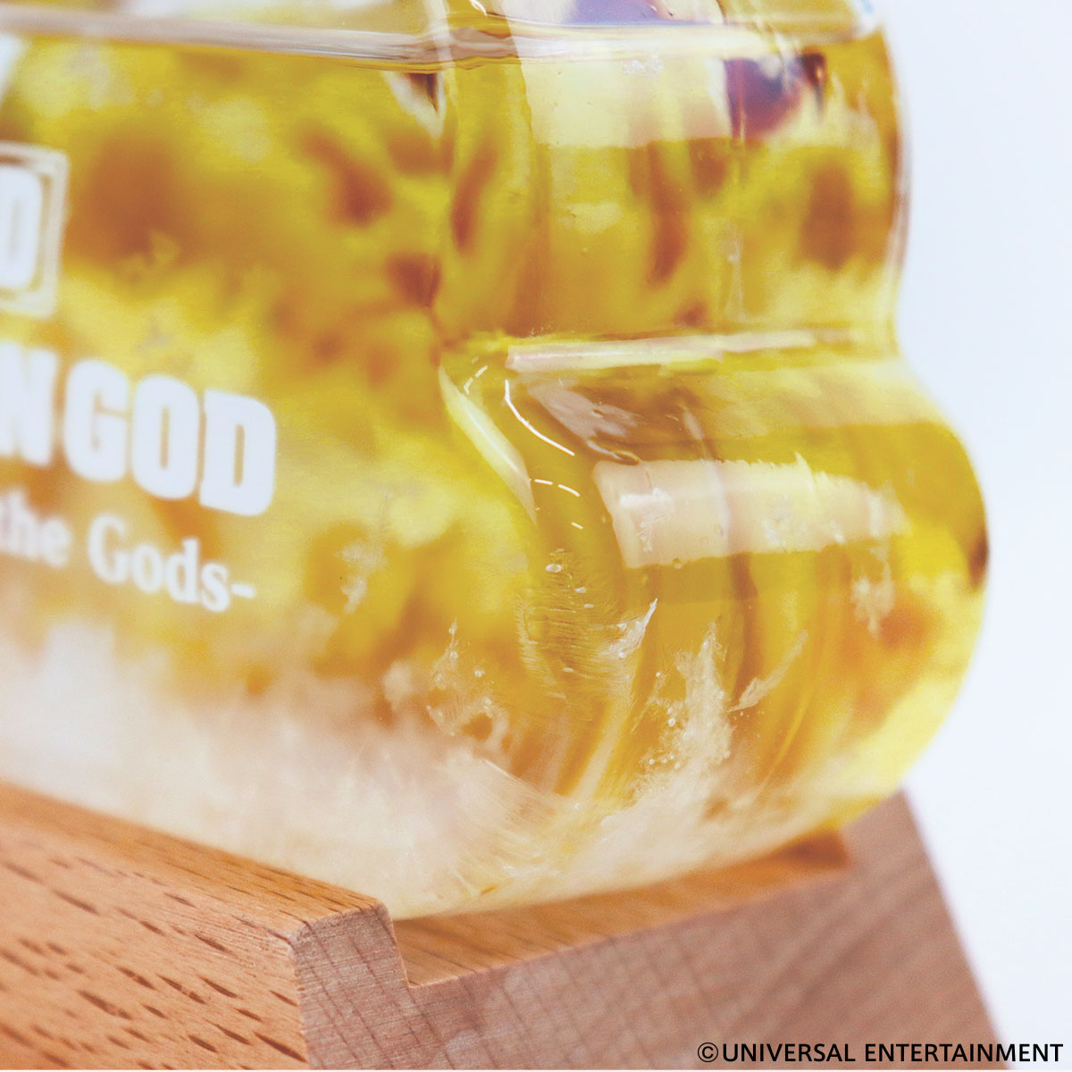 UNI-MARKETでは、容器の中に浮かぶ白い結晶を雲に見立てて「雲間から現れるGOD城」のデザインで作製しました。