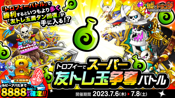 7月6日(木)より、ゲーム内のトロフィー獲得を目指して戦うバトルイベント「トロフィーバトル」が開催されます。今回は、トロフィーに挑み勝利すると、 “友トレ玉満タン回復”が獲得できる「トロフィーでスーパー友トレ玉争奪バトル」を同時開催。“ひとりで”でも“みんなで”でももらえますので、勝利を掴んでたくさんの報酬をゲットしましょう!