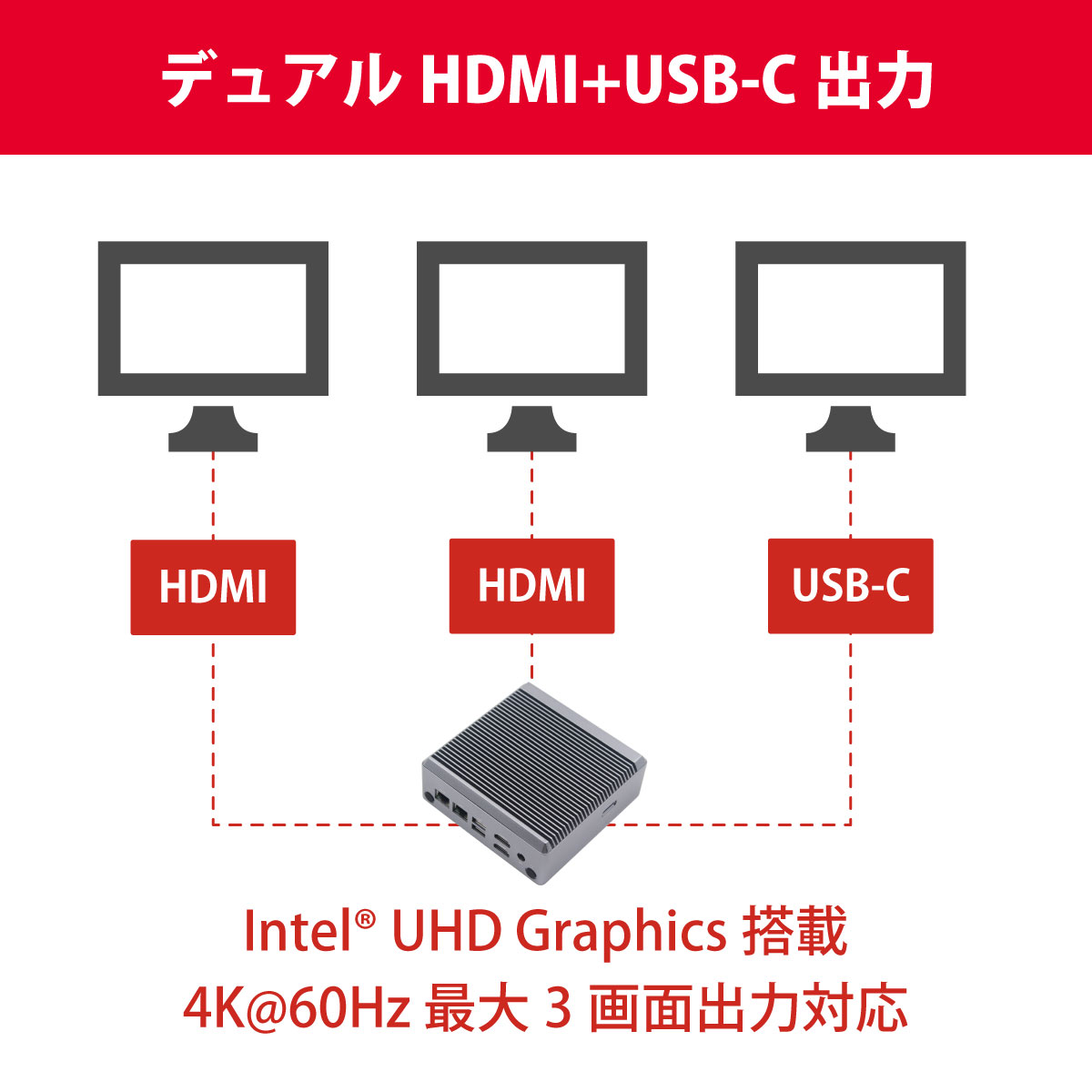 4K/60 Hzの出力に対応するHDMIを2基搭載し、更にUSB-CのDisplayPort 1.4 Alt Mode接続により最大で3画面同時出力に対応します。