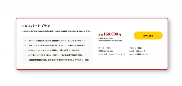 目的や規模にあわせた機能が選べるように、料金プランを一部改定。高性能サーバーを利用できるエキスパートプランが新たに加わりました。広告主とアフィリエイター最大6万人を抱える大規模ASPが運営できます。