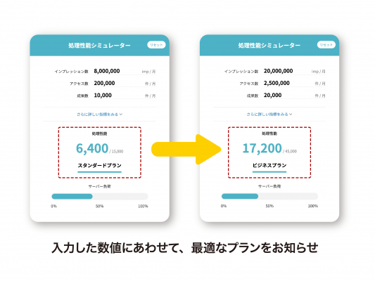 インプレッション数・アクセス数・成果数を入力して、必要な処理性能を予測するシミュレーターを導入。運用状況に最適なプラン選択をお手伝いします。事前のシミュレーションだけでなく、契約中のプラン見直しにも活用できます。