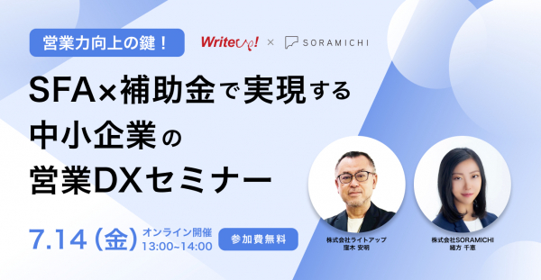 株式会社ライトアップ(本社:東京都渋谷区、代表取締役社長:白石崇、以下ライトアップ)は、株式会社SORAMICHI(本社:東京都千代田区、代表取締役社長:川本 広二、以下SORAMICHI)と共同で、中小企業の営業DX推進、補助金活用の新たなビジネス展開を提案するセミナーをオンラインにて開催します。