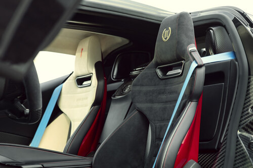 * 運転席シートのブラックのサステナブルレザーと助手席シートのベージュのレザーが映えるビスポークのインテリア。ブラックのアルカンターラと「Nino Farina」の文字は両シート共通。