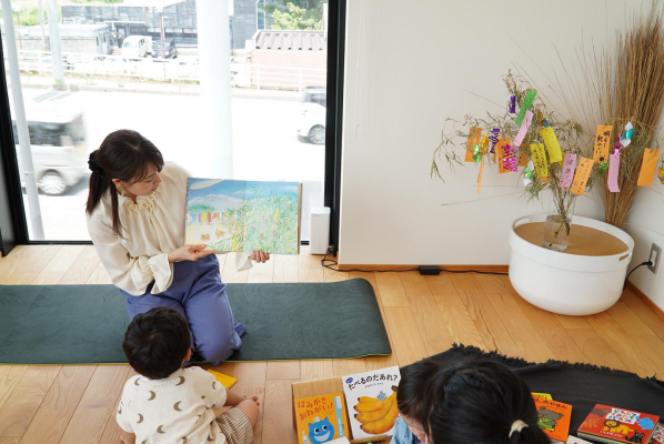 第二弾は、7月7日(金)に、チューリップテレビアナウンサー 舟本 真理さんと「絵本とふれあい遊び」を開催。前半は、Roots of Life TOYAMA専属講師 曳田 彩加が、赤ちゃんの身体のセルフケアの方法や親子で楽しめる遊びをベビーヨガを通して行いました。後半は、舟本 真理さんによる絵本の読み聞かせをしていただきました。ちぎり絵風の鮮やかで温かみのある七夕の絵本も読んでくださり、ママと赤ちゃんがいっしょに七夕の日を楽しむ事ができました。