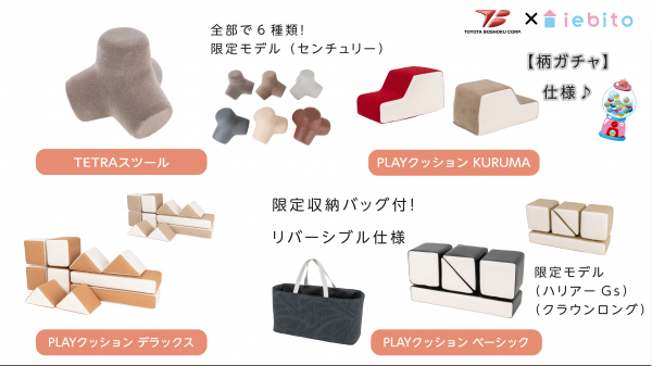 人気シリーズ「PLAYクッション」を手がける愛知のブランドiebito(イエビト)と、世界中のドライバーを支える上質な自動車シートを手がけるトヨタ紡織のコラボレーション企画。
