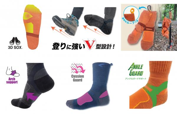 弊社が独自に培ってきた編み技術により、登山に必要な足首を守るアンクルガードサポートやアーチサポート機能など様々な機能を搭載し、特許技術3DSOXで足の形にフィットする構造により快適な履き心地を実現。また、従来品と比較してかかとをゆったり包み込むように大きく編んだかかとのホールド感がアップするのはもちろんのこと、この特殊なかかと編み構造から生まれるV字型のフォルム(V型設計)が足首の屈曲する動きにフィットして登りをサポートします。