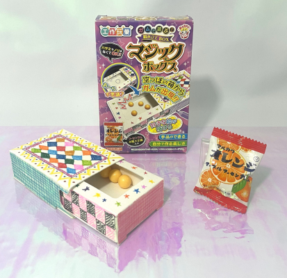 「組み立てマジックボックス」とは、付属の紙パーツを組み立てて中身を出したり消したりで出来るマジックボックスをつくり付属のガムを使い手品遊びができる玩具菓子です。付属のガム以外でもいろいろな物を使用して遊ぶことができます。