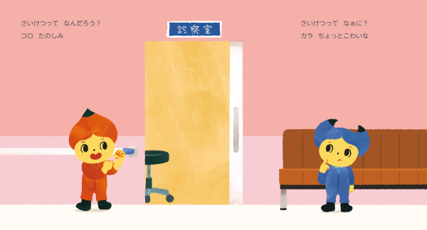 この絵本では、採血を「なぜするのか?」「どのようにするのか?」対話形式で解説していきます。男女に限定されない中性的なキャラクターや、擬人化した親しみやすいイラスト、説明文を多用せずオノマトペも活用するなど、子どもにもわかりやすいしかけが盛りだくさん!