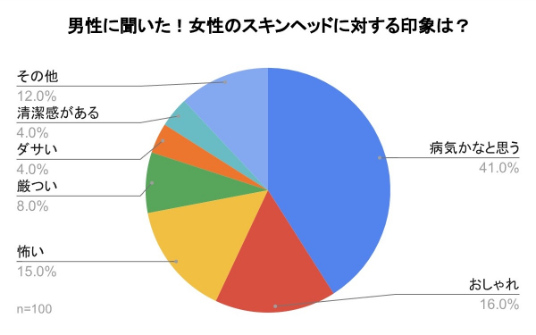 「スキンヘッドの女性に対する印象を教えてください。」の質問では、『病気かなと思う』が41%、『おしゃれ』が16%、『怖い』が15%、『厳つい』が8%、『ダサい』が4%、『清潔感がある』が4%、『その他』が12%となり、病気という印象が多数を占める結果となりました。