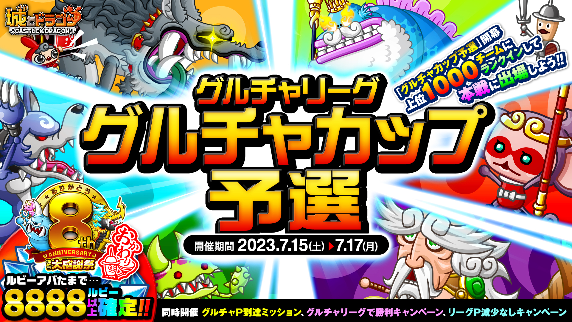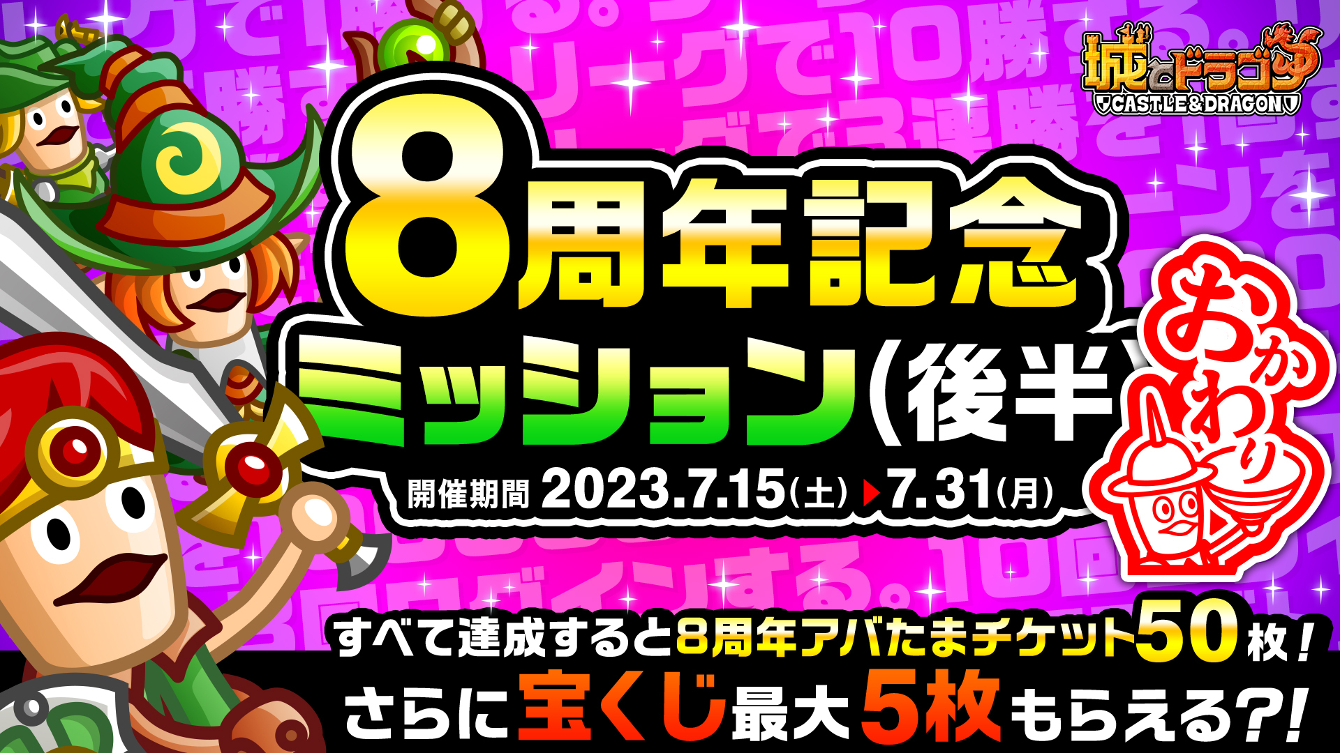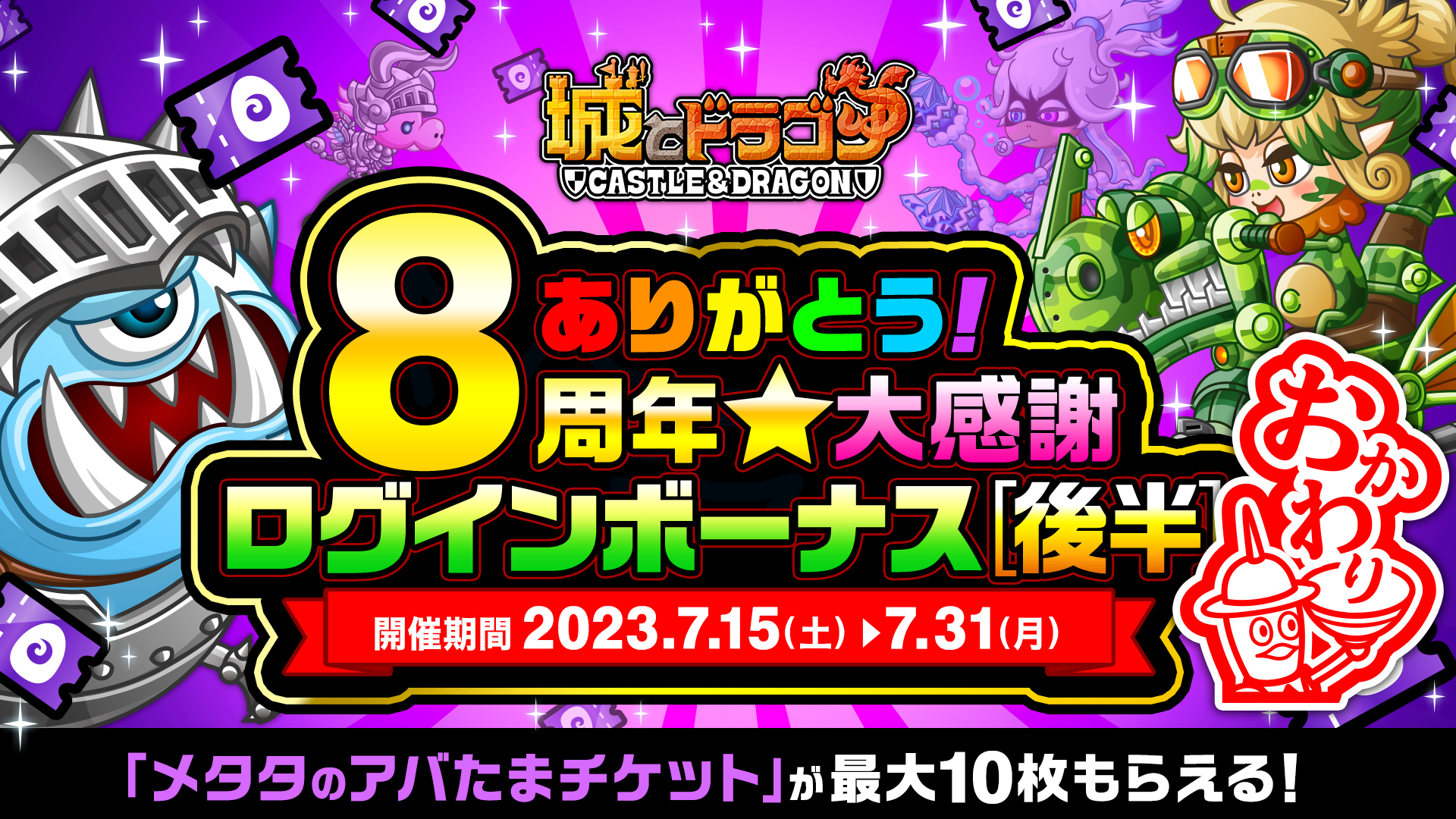 株式会社アソビズム(本社:東京都千代田区、代表取締役:大手智之)は、App Store・Google Playにて好評配信中の『城とドラゴン』で、「ありがとう8周年!城ドラ大感謝祭おかわり(後半)」を2023年7月15日(土)より開催いたします。
