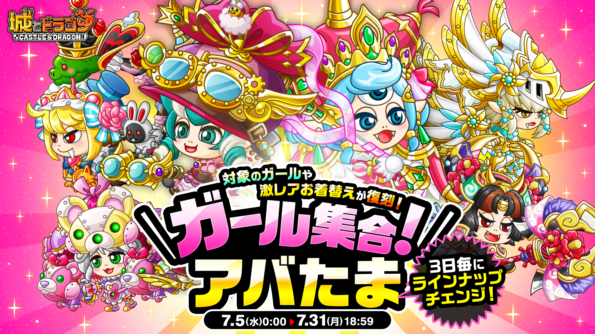 『城とドラゴン』の8周年を記念して開催された大盤振る舞いキャンペーン「ありがとう8周年!城ドラ大感謝祭おかわり」の後半が開始!必ず“8888ルビー”以上が当たる「8888ルビー以上確定?!ルビーアバたま」や、最高“88888ルビー”と特別なフレームが当たる「大感謝祭!城ドラ宝くじ」に加え、「ガールソング獲得チャンス」や「ガール集合!アバたま」といった新要素も引き続き登場します。後半の「8周年大感謝祭おかわり」もぜひお楽しみください!
